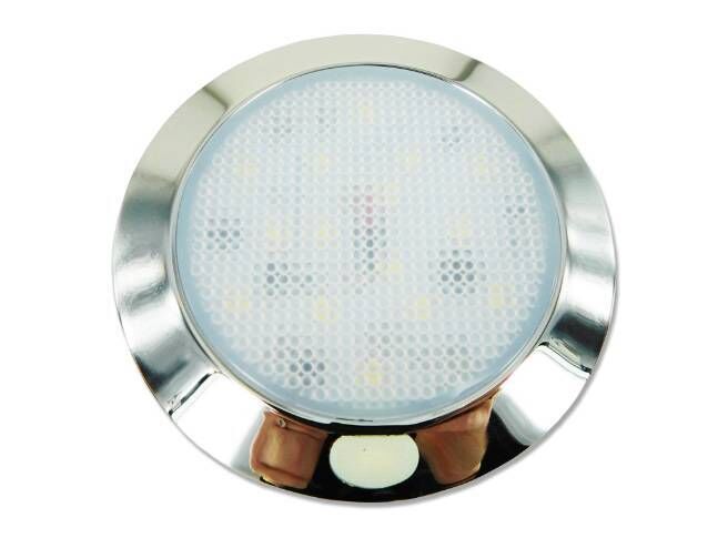 Ideal for use in all interior caravan & motorhome applications this light is commonly used as cabin down light. Blue indicator on switch for easy approach at night. Cool white in colour All screws covered by cover around light. - 12volt. - Lumens 175. - 0.18 Amp Draw - Weight 37g - 2.3 Watts