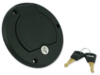 Lockable water filler supplied with 2 keys. Flap door opens 180 degrees to be flush with RV wall. Same footprint as previous Camec water filler. Key features: - Hinged flap door - One piece filler neck - 25mm barb on filler neck - 10mm barb on breather - Camec one key fits all barrel housing