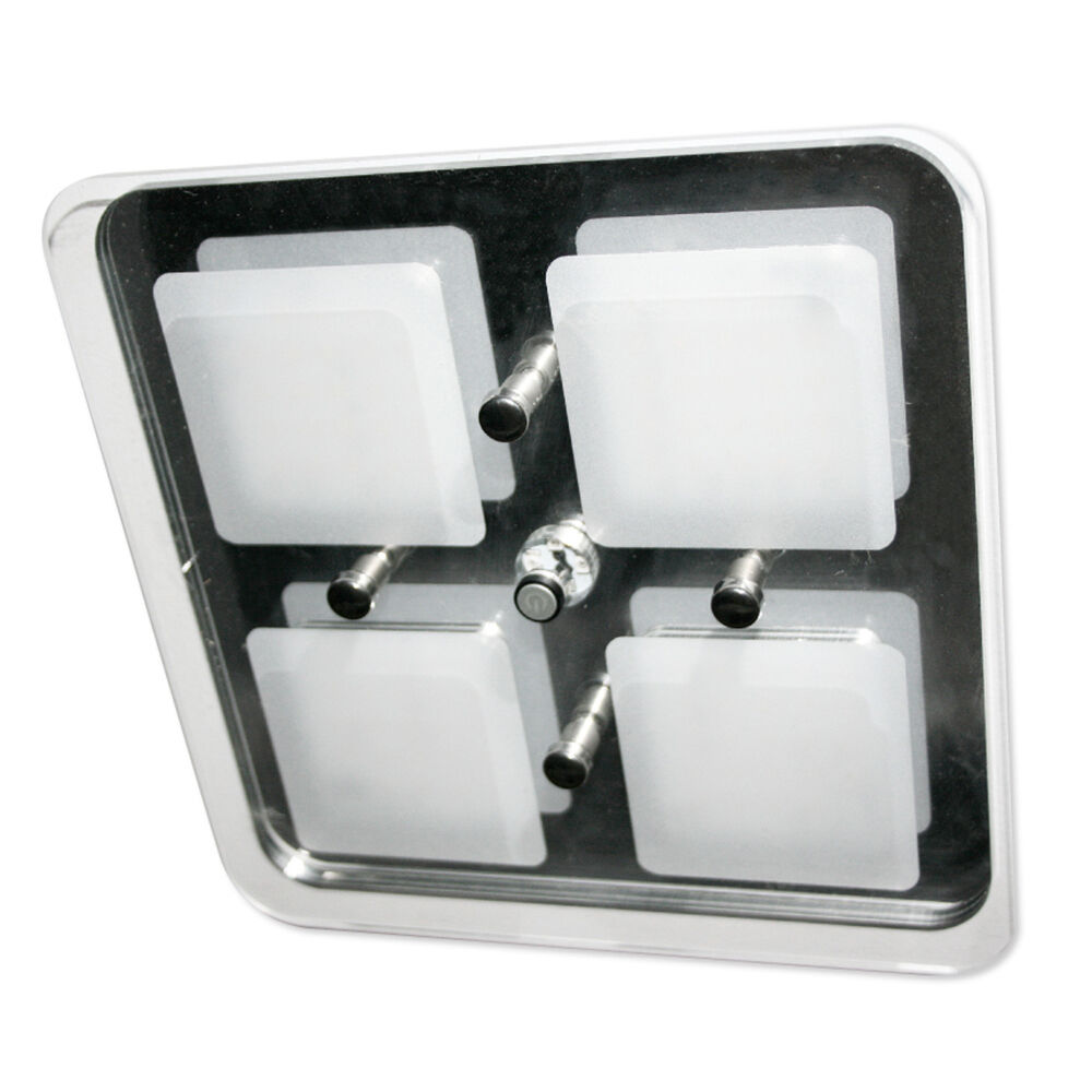 This stylish chrome and glass finished light compliments the interior of any modern RV and features a Blue night light function. Key features: - 3 different light intensity settings - Blue night light - 120 degrees flat angle light illumination - Centre frosted internally for glare reduction Specifications: Operating voltage: 12V DC Dimensions: 180mm x 180mm Setting 1 -140 LUMENS Setting 2 -300 LUMENS Setting 3 -600 LUMENS