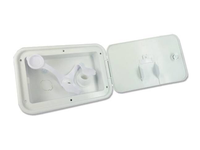 The Coast RV water filler and inlet features a lockable lid as well as a provision for a 2nd watertank filler point and a mains pressure connection. This unit is commonly fitted to late model Jayco caravans. Key features: - Lockable lid - Single or dual watertank fillers - Mains pressure inlet - 2 x breather fittings Dimensions & Specifications: - White plastic - Overall size: 23cm (L) x 15.2cm (W) - Cut out size: 18.5cm (L) x 11cm (H)