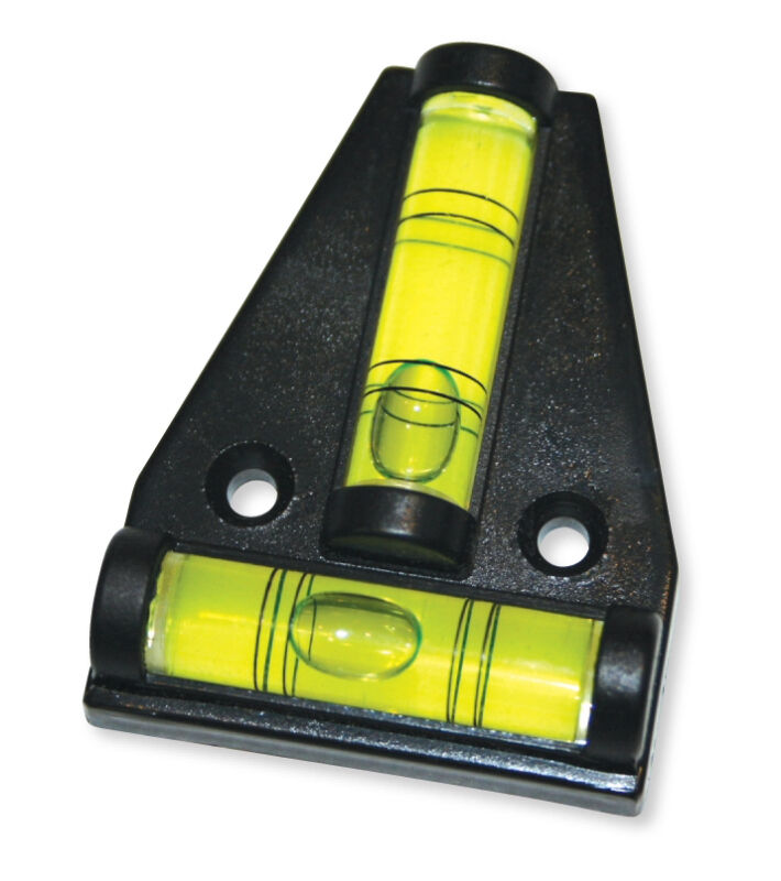 Enjoy a great nights rest in your perfectly level van with this handy Plastic T- Level. Screw-mounted level provides front-to-back and side-to-side levelling. Key features: 2 way T-level great for levelling your RV Can be screwed to A-frame