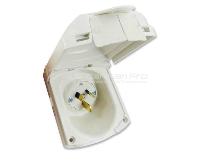 The new style Clipsal 15 Amp power inlet is a flush inlet with a weatherproof flap. It is fitted to most makes of modern caravans and motorhomes and is used to connect your power into your RV.