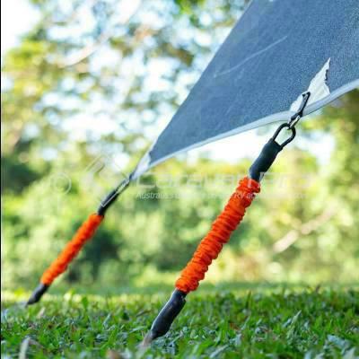 The springs allow for flex in the tie down of privacy screens which ensures strong gusts of wind are readily absorbed and pegs remain securely fixed to the ground and privacy screen eyelets are not damaged.