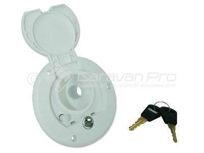 Lockable water filler supplied with 2 keys. Flap door opens 180 degrees to be flush with RV wall. Same footprint as previous Camec water filler.
